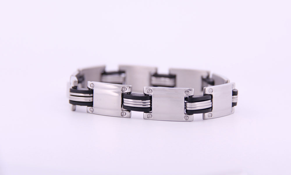 This stylish bracelet combines polished stainless steel plates with black rubber links, creating a sleek and contemporary look. The fold-over clasp ensures a secure and comfortable fit, making it a durable and fashionable accessory for everyday wear.